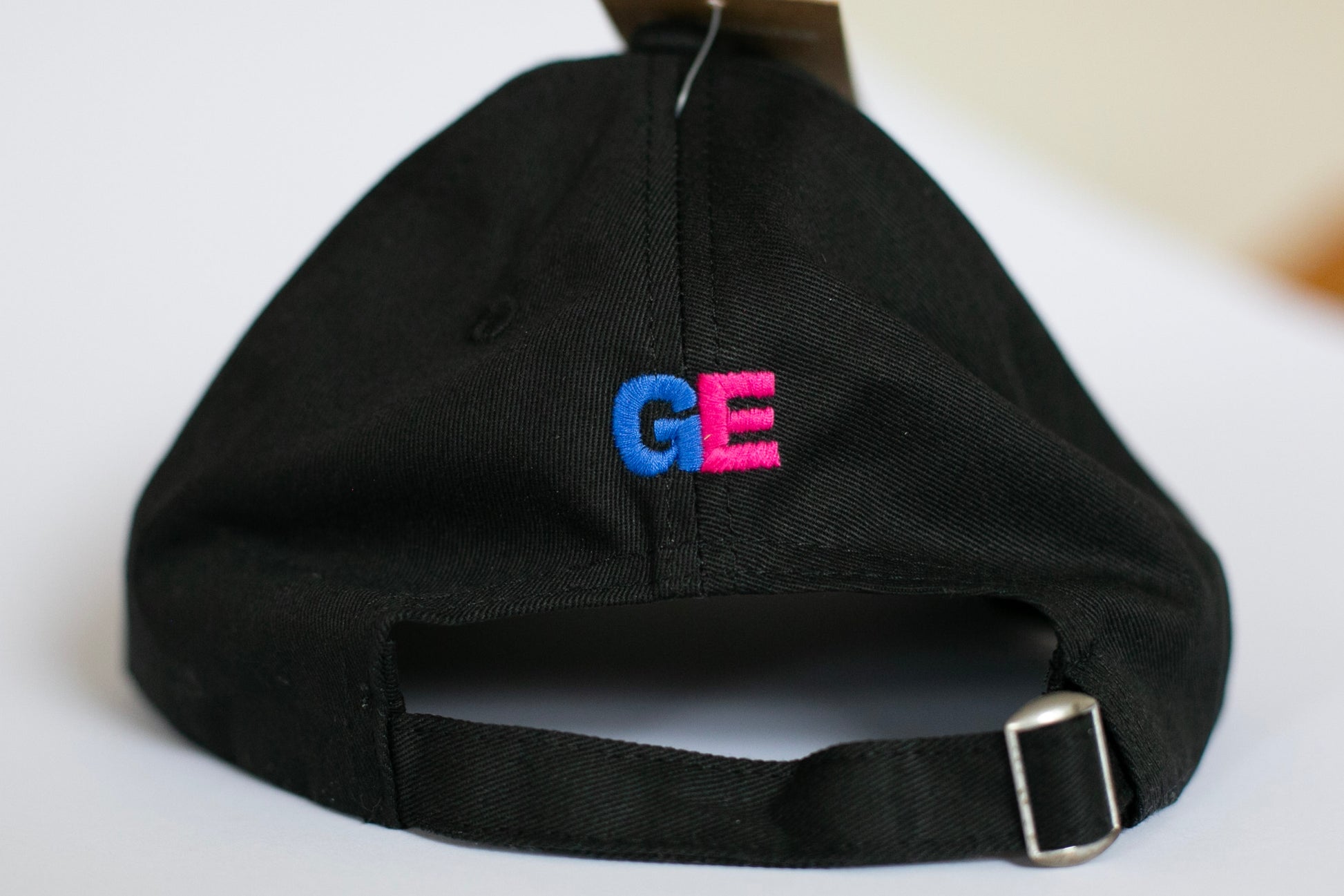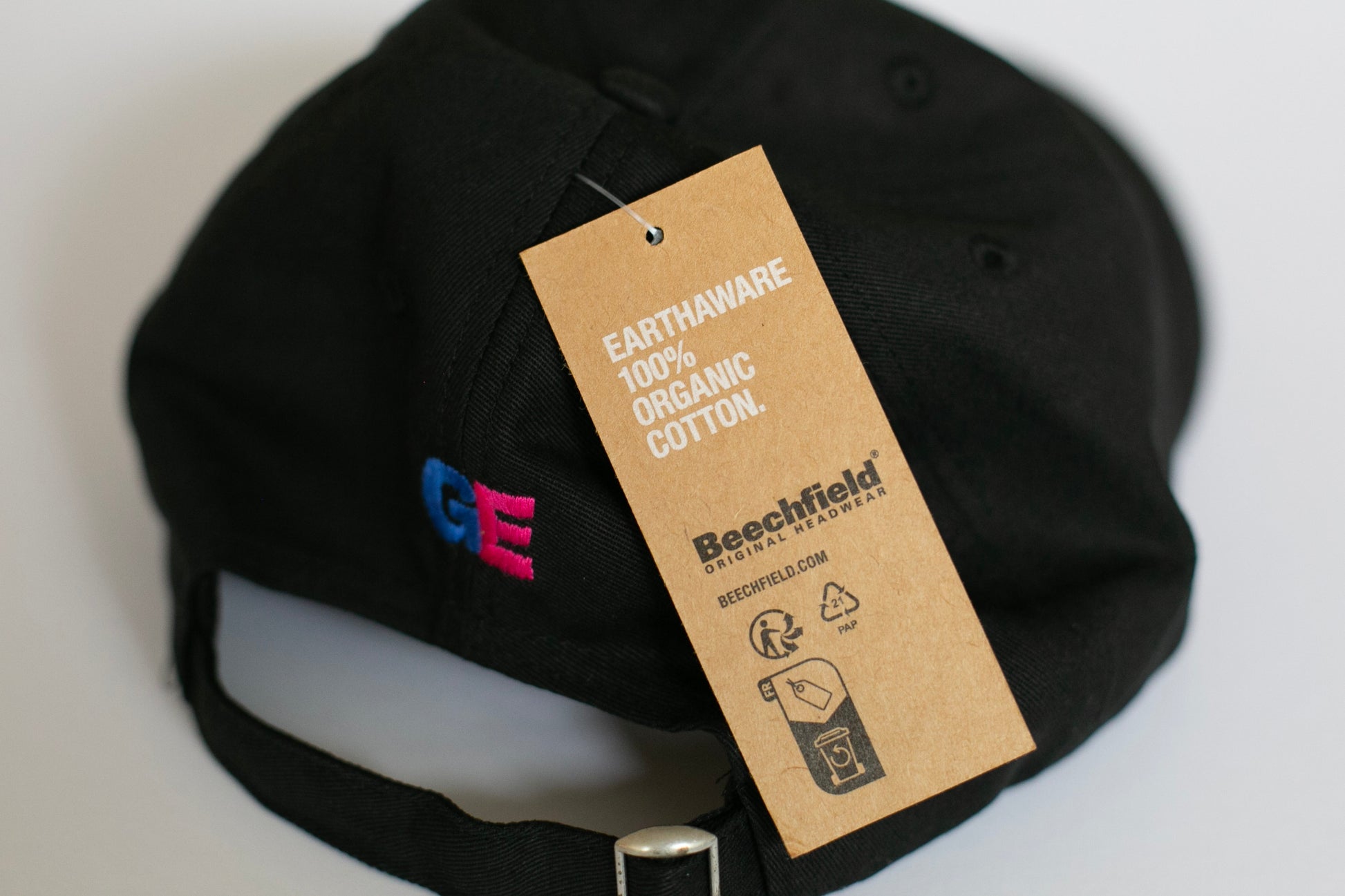 Text on front and back is embroidered.